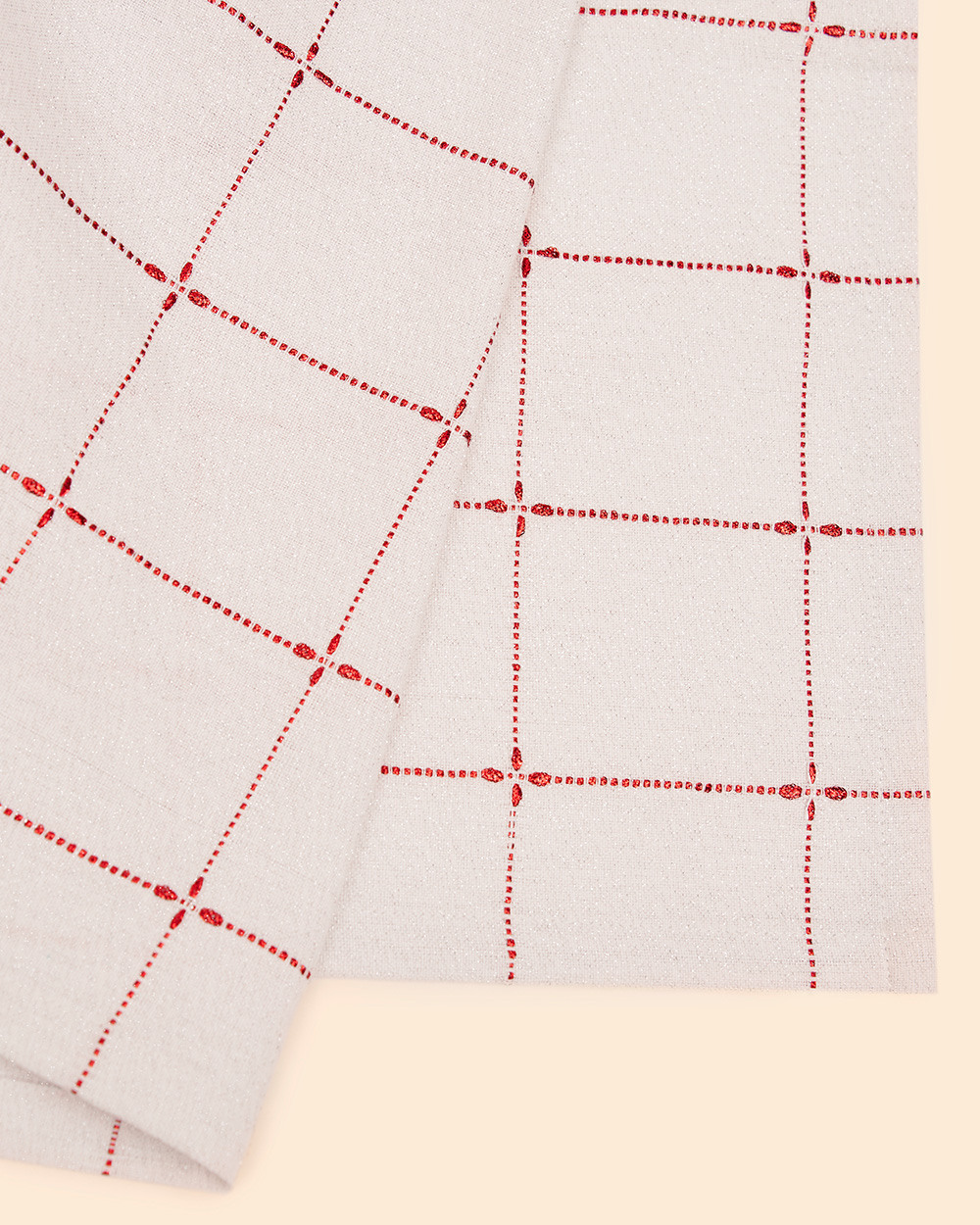 Серебристая скатерть из натурального хлопка и люрекса с изысканной красной строчкой — настоящее украшение праздничного стола, которое придаст торжеству особенную изысканность и роскошь. Натуральный хлопок, составляющий основу ткани, дарит мягкость и легкость прикосновения, обеспечивая приятные ощущения при соприкосновении рук с поверхностью стола. Добавленный люрекс привносит нотку блеска и праздничное настроение, подчеркивая уникальность изделия и привлекая внимание гостей. Красная строчка, образующая клетчатый рисунок, добавляет изделию благородства и стиля, подчеркивает красоту прочих элементов сервировки. Состав ткани позволяет сочетать нежность натуральных волокон с визуальной привлекательностью блестящих нитей люрекса, даря ощущение праздника и особого случая. Доступная в двух удобных размерах (150х150 и 150х250), такая скатерть подходит как для небольших семейных ужинов, так и для больших застолий. Уникальное сочетание материалов подарит функциональность и долговечность. Такая скатерть непременно украсит ваш праздничный новогодний стол, став ярким элементом декора и основой для общей сервировки.