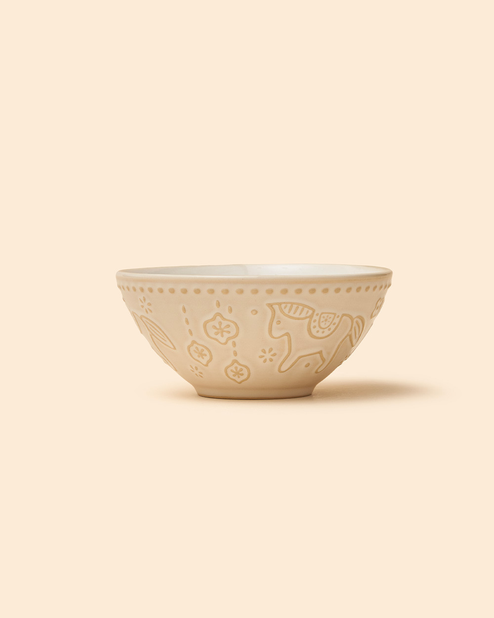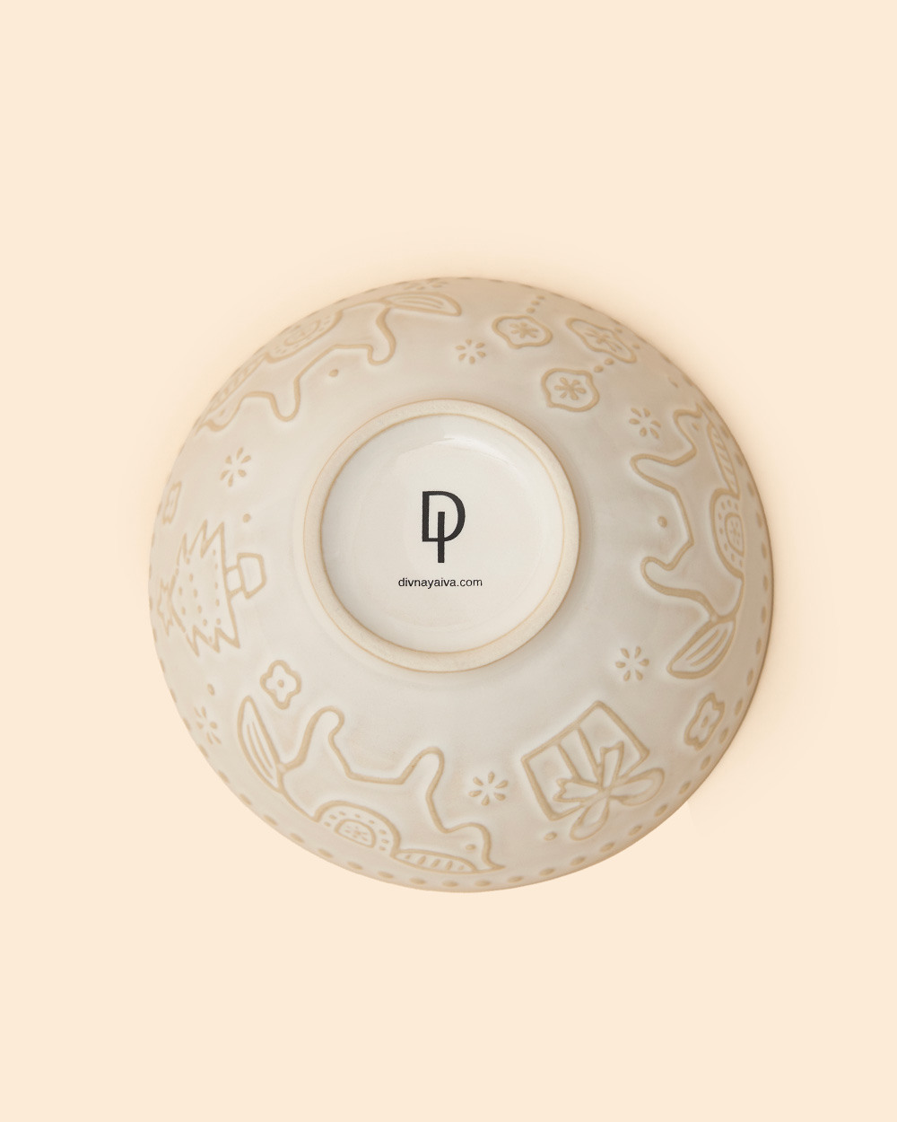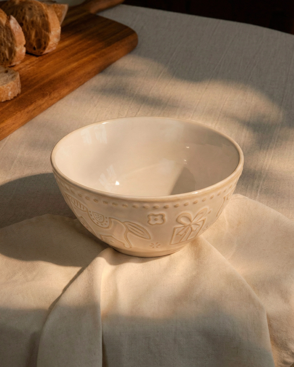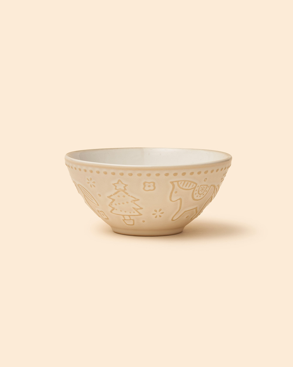 Миска для закусок молочного оттенка украшенная рельефным узором, воплощает в себе дух праздника и традиции. Каждый предмет этого набора – настоящий шедевр, созданный с любовью и вниманием к деталям. Рисунок, украшающий поверхность посуды, включает в себя классические символы Нового Года: снежинки, елочки, подарки и другие элементы, которые ассоциируются с этим волшебным временем.