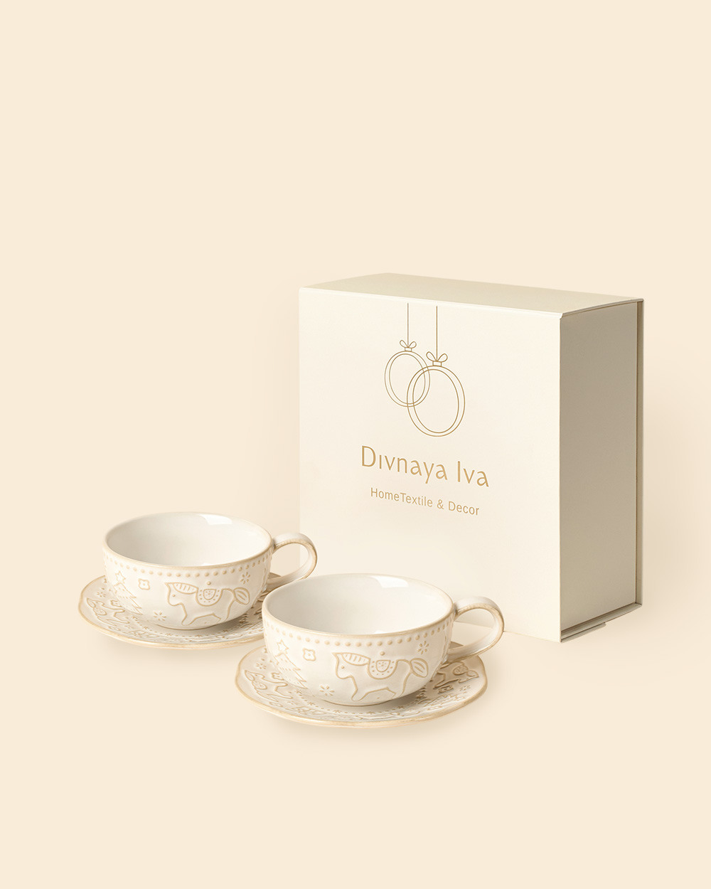 Набор из двух фарфоровых чайных пар молочного цвета – это истинное воплощение зимнего уюта и праздничной атмосферы.