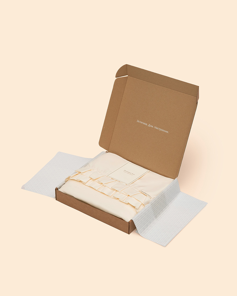 Сатин кремового оттенка переливается мягким блеском, отражающим свет, придавая утонченной красоты вашему пространству для отдыха.