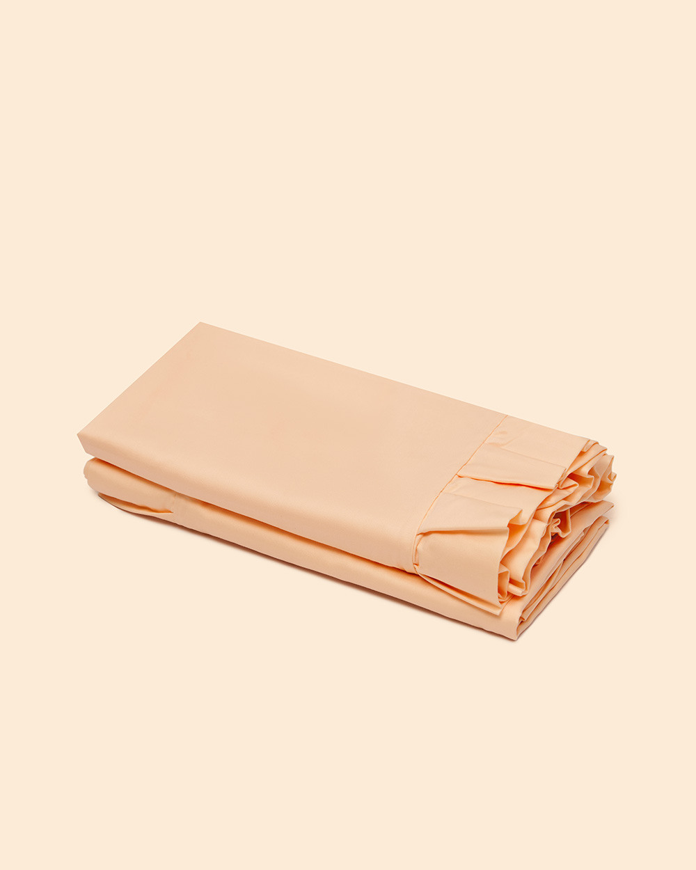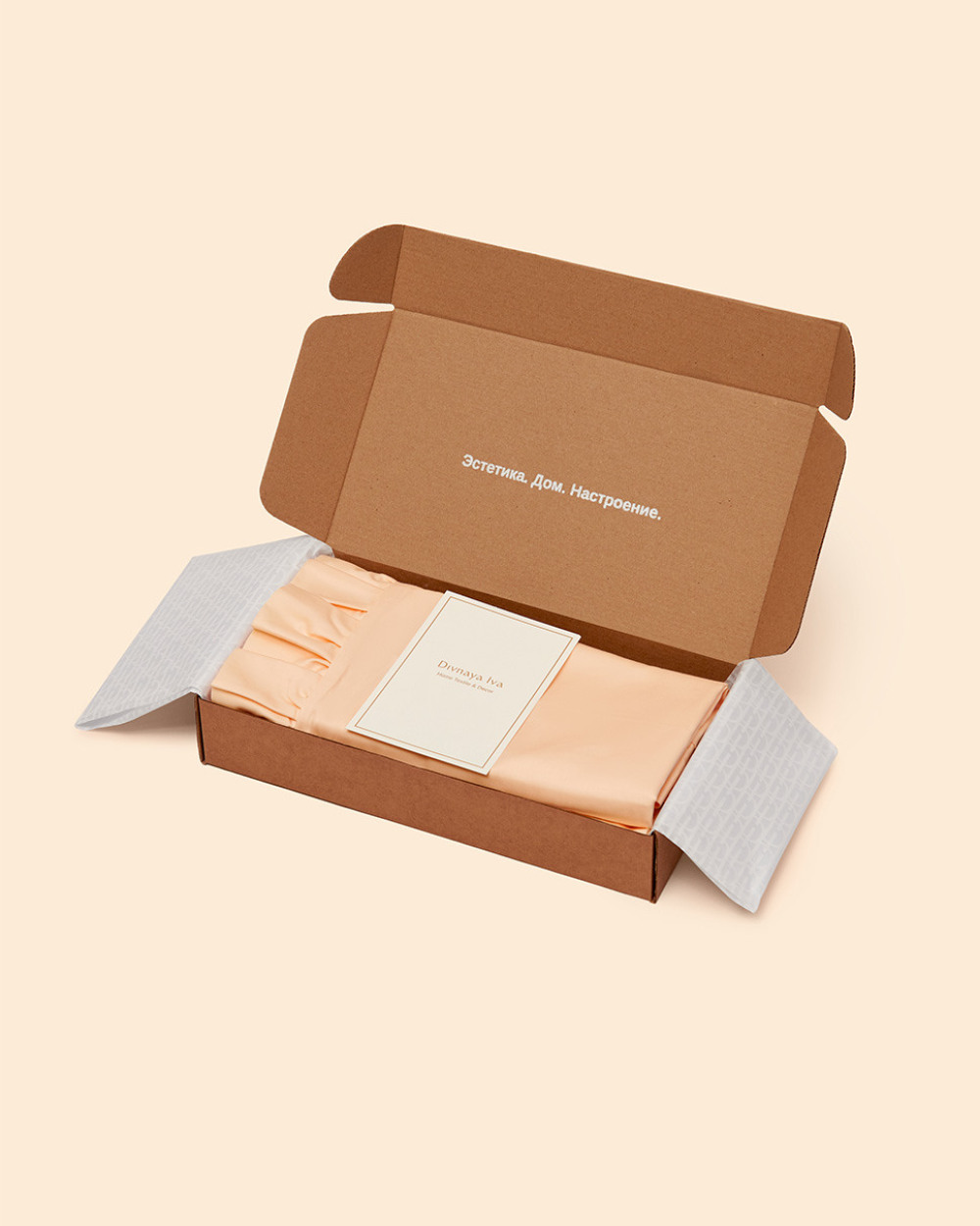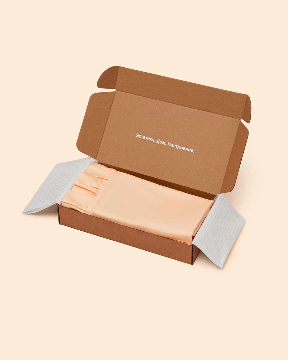 Сатин персикового оттенка переливается мягким блеском, отражающим свет, придавая утонченной красоты вашему пространству для отдыха.