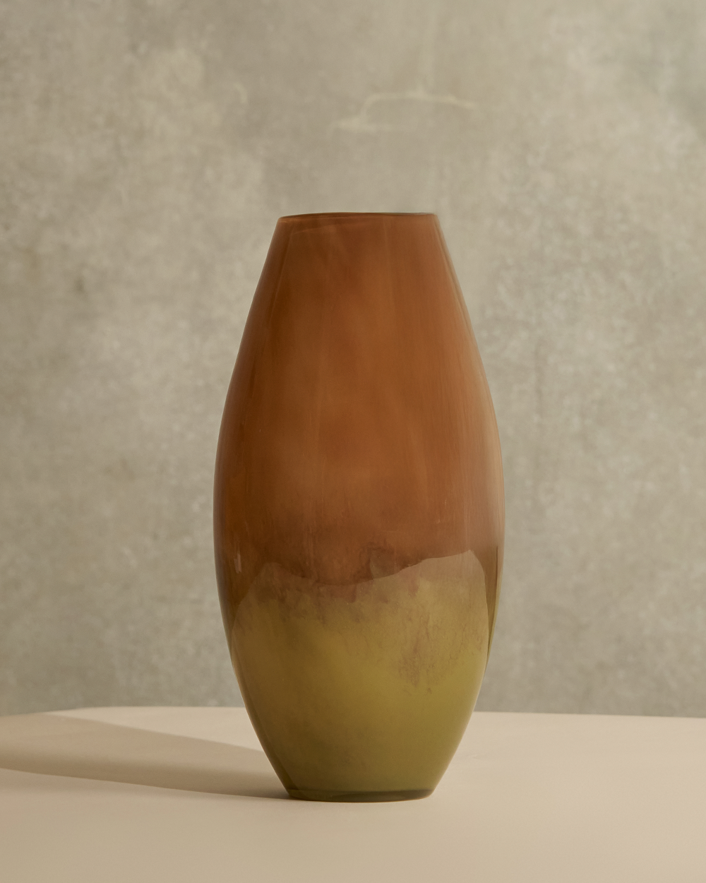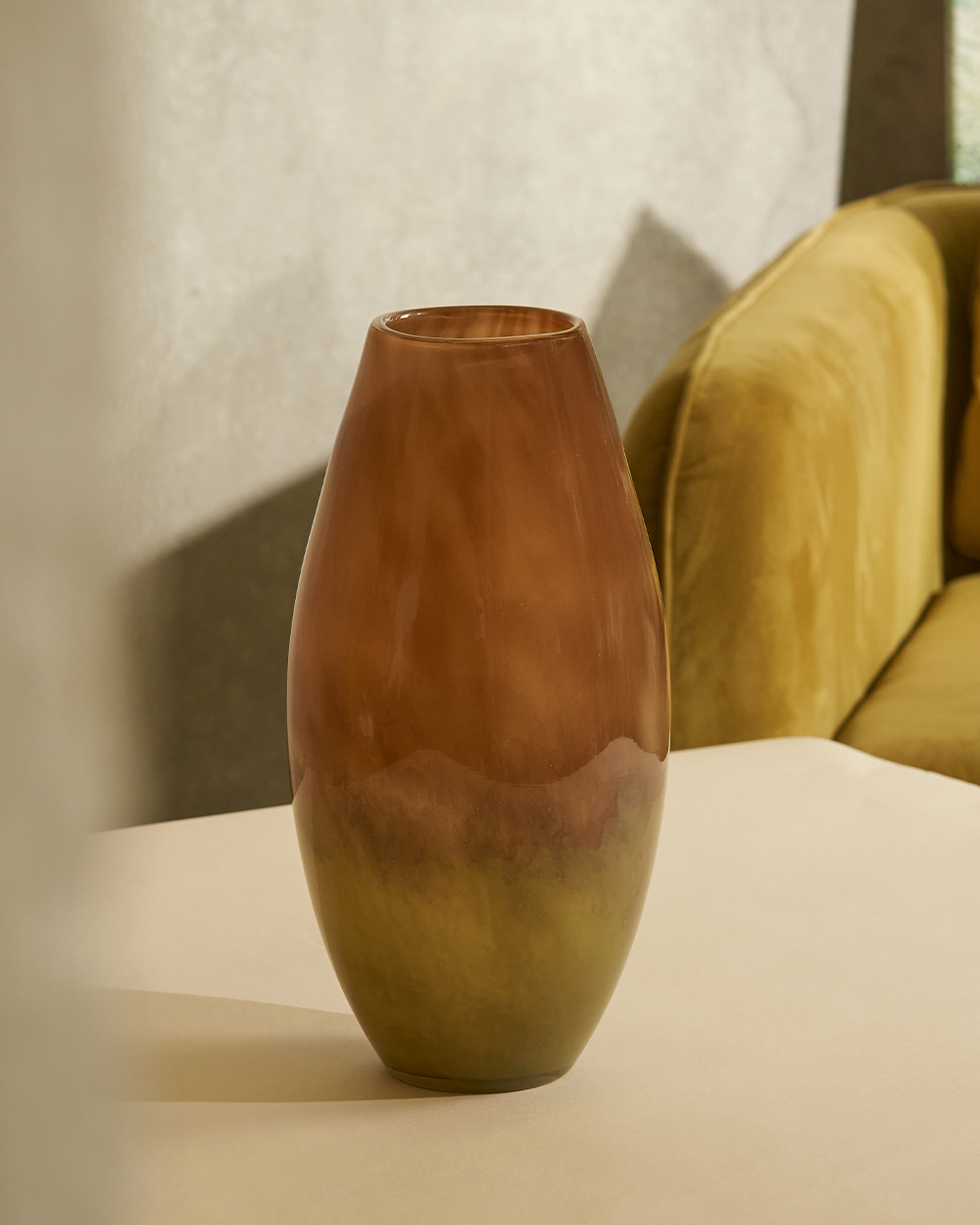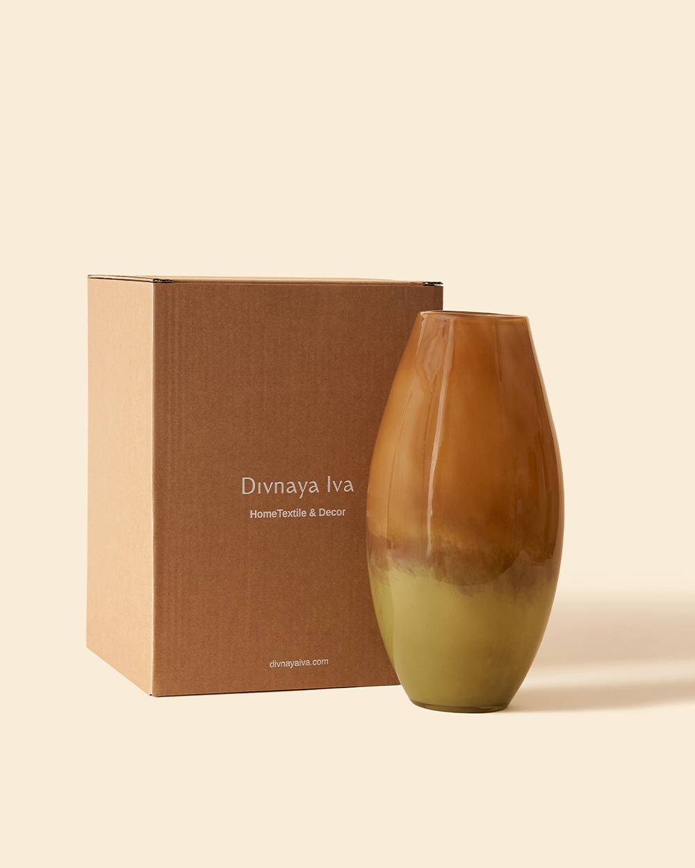 Эта ваза создана для того, чтобы стать изюминкой вашего интерьера. Изготовленная вручную из высококачественного стекла, она обладает градиентным переходом от светло-оливкового к коричневому, что придает ей неповторимый и изысканный вид. Ее округлая форма с широким основанием и сужающимся верхом не только делает ее устойчивой, но и подчеркивает ее элегантность.