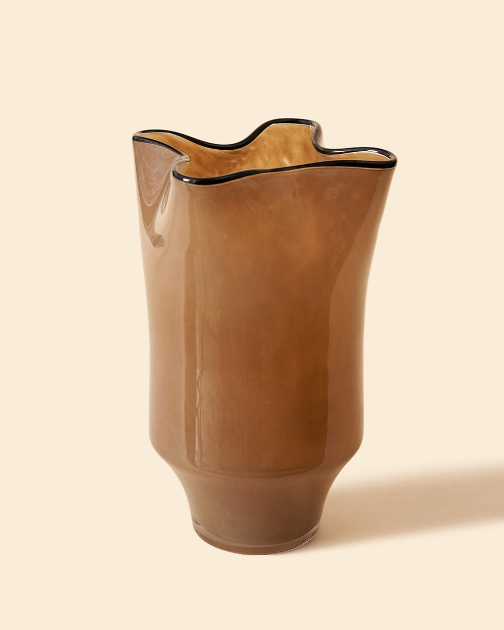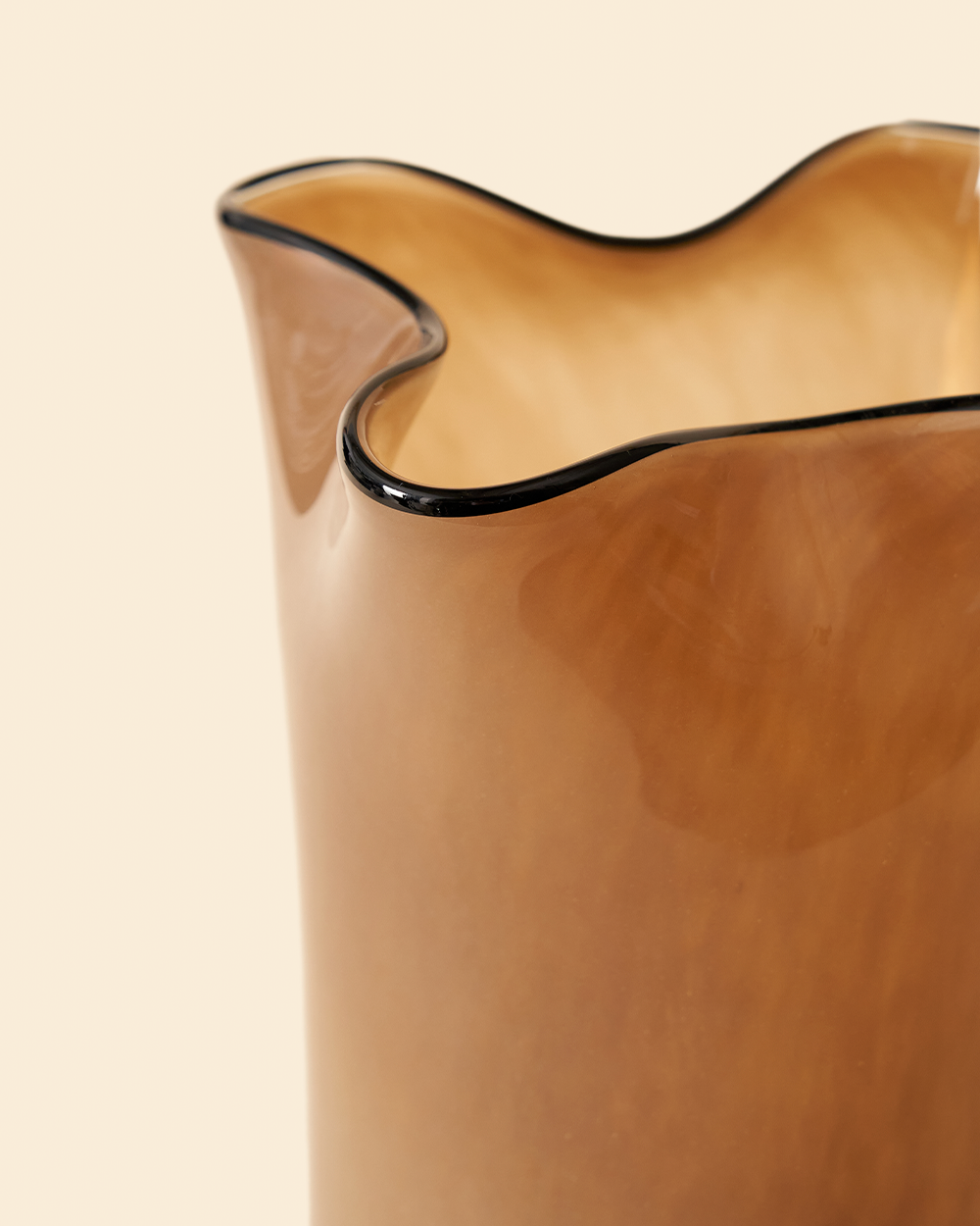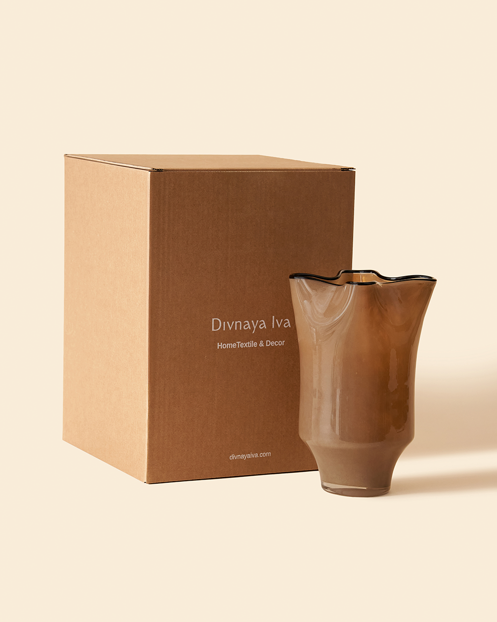 Кофейный оттенок стекла придает вазе изысканность и теплоту, делая ее идеальным дополнением к любому интерьеру. Необычная форма верхней части вазы в виде изогнутых линий, напоминающих цветок, придает вазе особую выразительность и художественную ценность. А контрастный кант в черном оттенке подчеркивает изысканность очертаний, добавляя элегантности и утонченности.