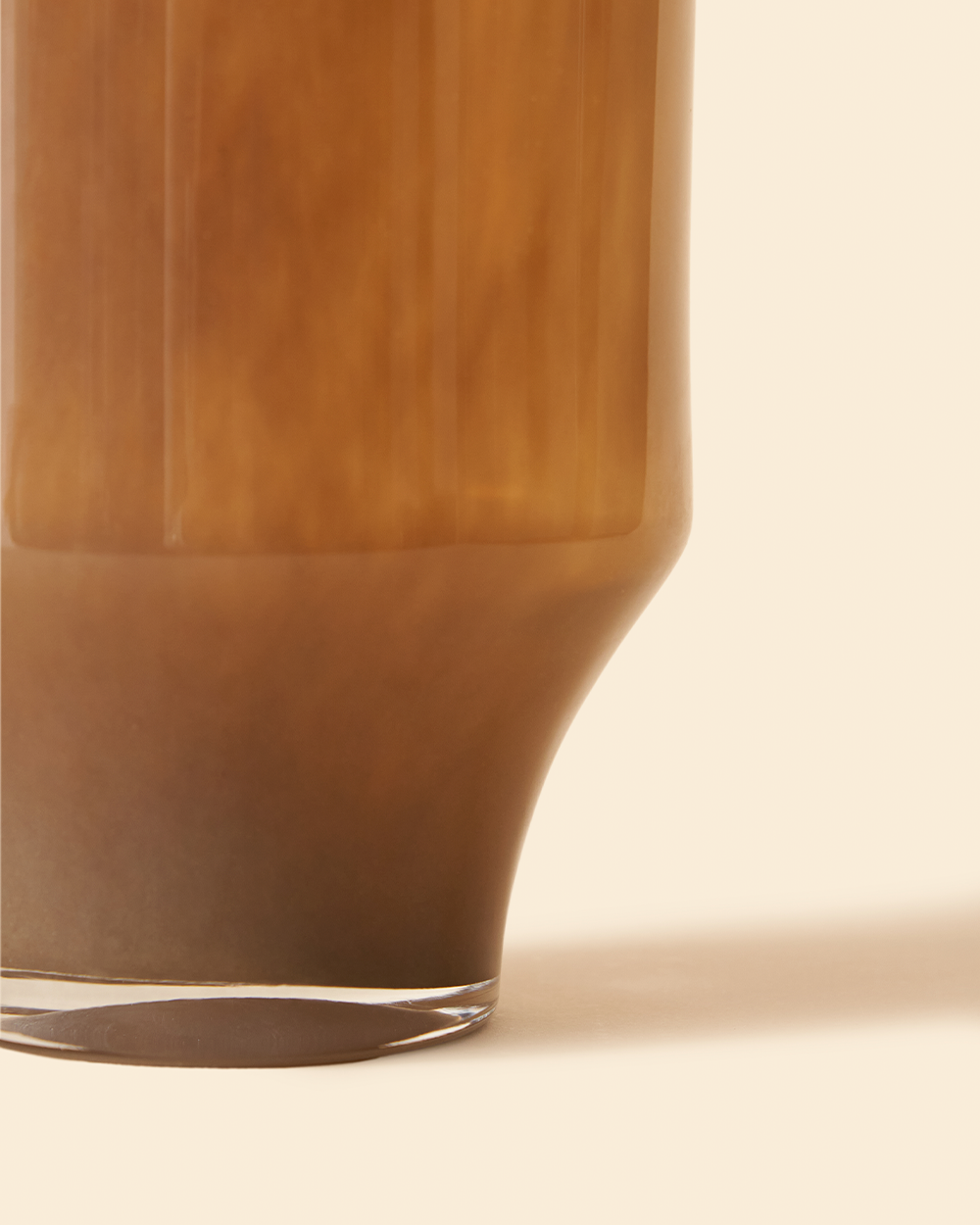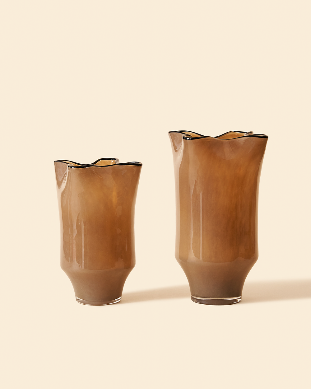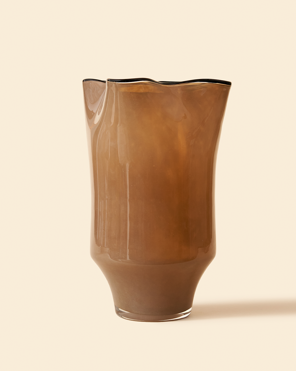 Кофейный оттенок стекла придает вазе изысканность и теплоту, делая ее идеальным дополнением к любому интерьеру. Необычная форма верхней части вазы в виде изогнутых линий, напоминающих цветок, придает вазе особую выразительность и художественную ценность. А контрастный кант в черном оттенке подчеркивает изысканность очертаний, добавляя элегантности и утонченности.